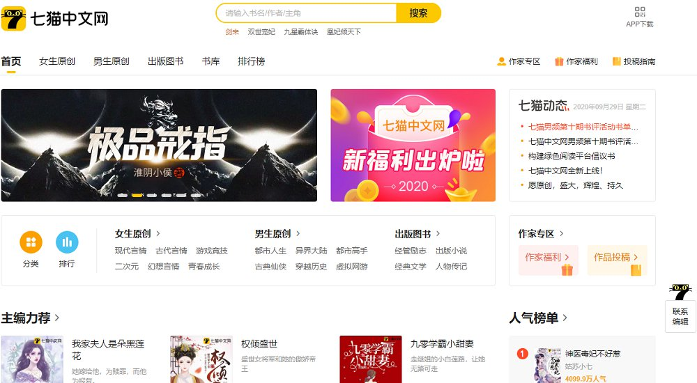 七猫中文网 推广置顶推荐七猫中文网(免费小说大全)与国内各大小说站合作,为小说爱好者提供更多更全的各类免费小说上百万本。七猫免费小说包括言情小说,穿越小说,玄幻小说,校园小说,都市小说,武侠小说,网游小说等等。七猫中文网只有想不到,没有找不到!