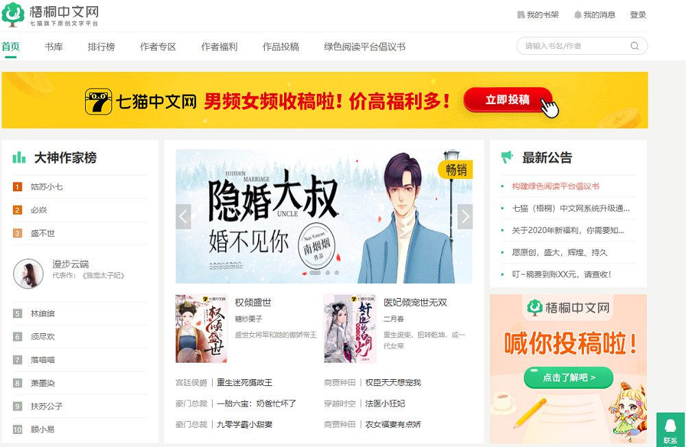 梧桐中文网 推广置顶推荐梧桐中文网(七猫中文网)创立于2017年5月,是七猫品牌旗下重点面向网络文学作者的综合服务平台,主要专注于精品原创女频网络文学IP的挖掘、孵化与输出运营。经过近2年的积累,已经培养出了一支擅于选题、包装、运营,拥有广泛作者资源与编辑功底的优秀责编团队,可以为作者提供创作指导、作品包装、宣传运营等全方位服务。